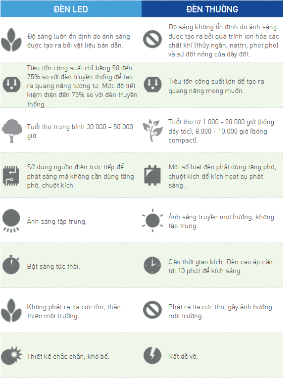Bảng so sánh giữa đèn LED và đèn truyền thống